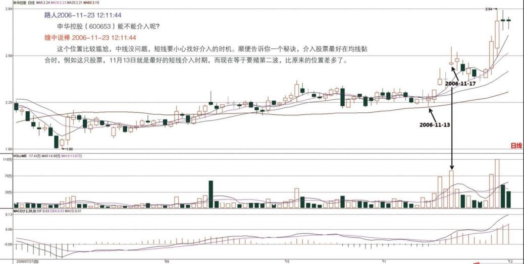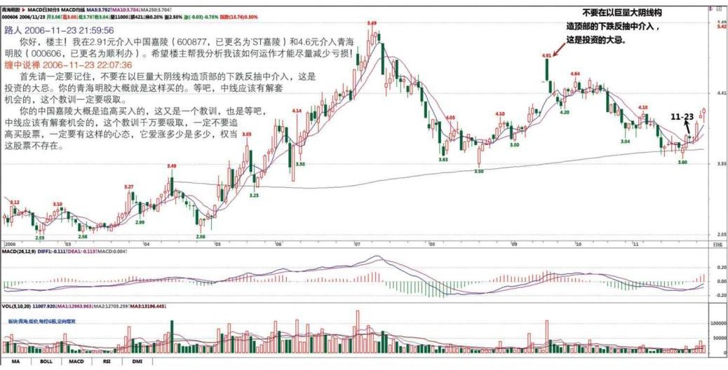 中线就不存在出手的问题,短线已经错过出手的好时机,你没看本 ID 写的《如何教你炒股票》吗,放巨量后就是一个好的短线出手时机,你看它在 11 月 17 日是不是特别符合这个道理?(2006-11-23 12:32:23)