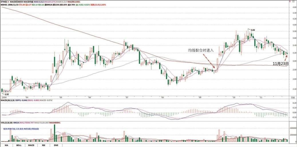 陆家嘴(600663)是典型的在年线上盘整,然后所有均线黏合后产生中线行情的例子。各位可以好好研究该日线图形去体会。