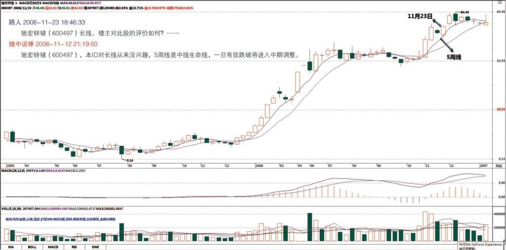 驰宏锌锗(600497),本 ID 对长线从来没兴趣,5 周线是中线生命线,一旦有效跌破将进入中期调整。(2006-11-23 21:19:50)