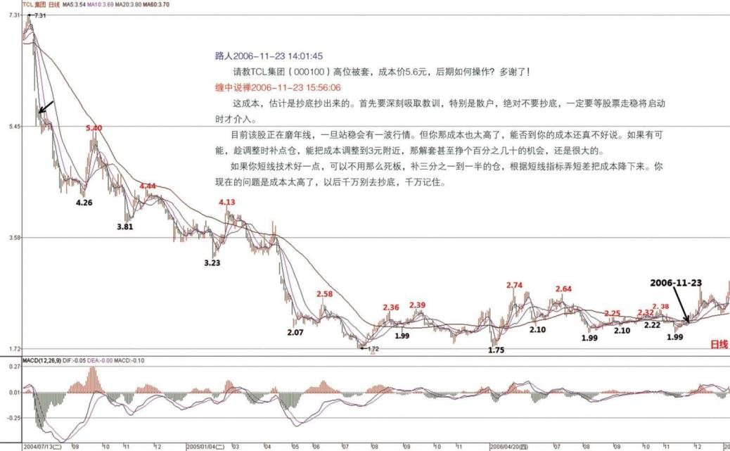 要养成尽量不玩第二波的习惯。该股票是一波大涨势后的整理,这种整理最烦人了,骗线又多。该股中线没问题,短线要耐心了。压力在 250 周线,目前在 7.72 元,能突破站稳则第二波行情展开,否则还是箱型整理。(2006-11-23 15:44:07)