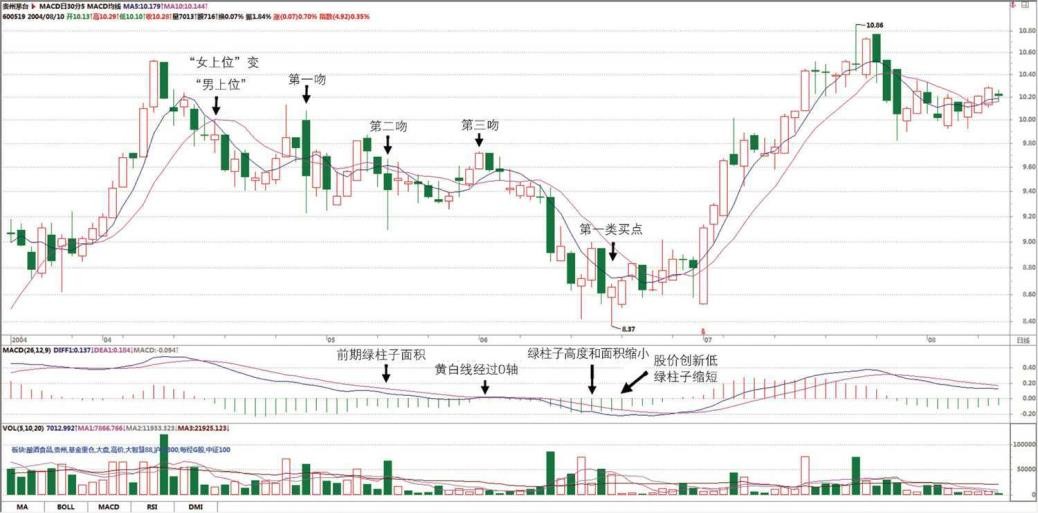 月 1 日,都是典型的湿吻,但前两次后的下跌都没有出现背驰,只有第三次,出现明显的背驰性走势,6 月 18 日创下低点后,MACD 的绿柱子明显比前面的要短,这就构成了日线上的第一类买点,而这个买点,在周线上就是第二类买点。注意,后面由于除权,价位上似乎比这个要低了,其实并没有。