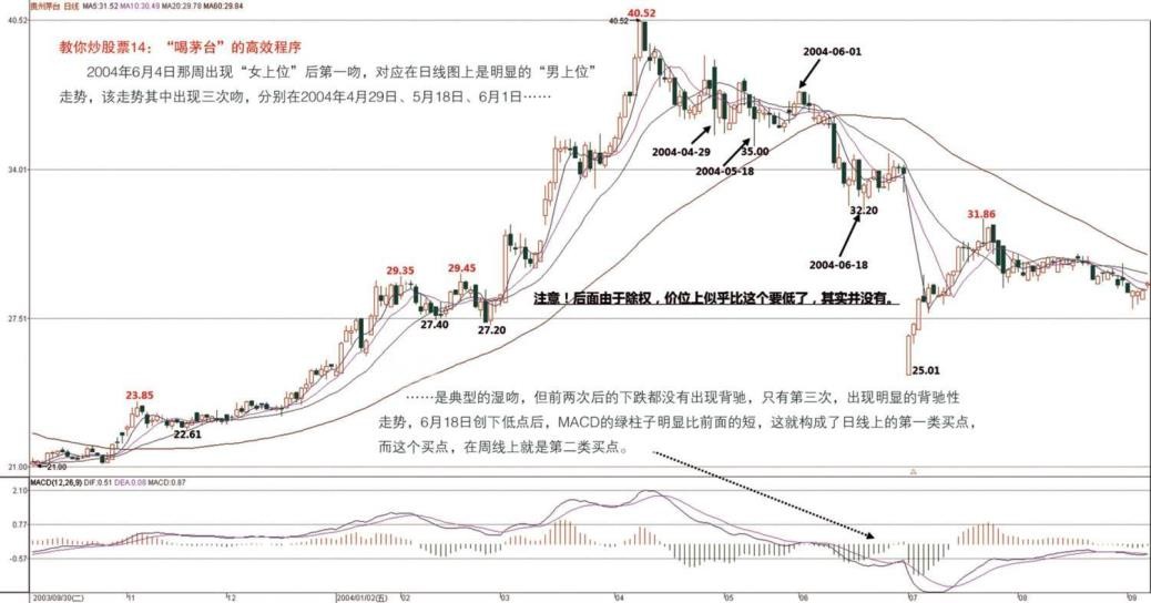 对于贵州茅台,2004 年 6 月 4 日那周出现“女上位”后第一吻,对应在日线图上是明
