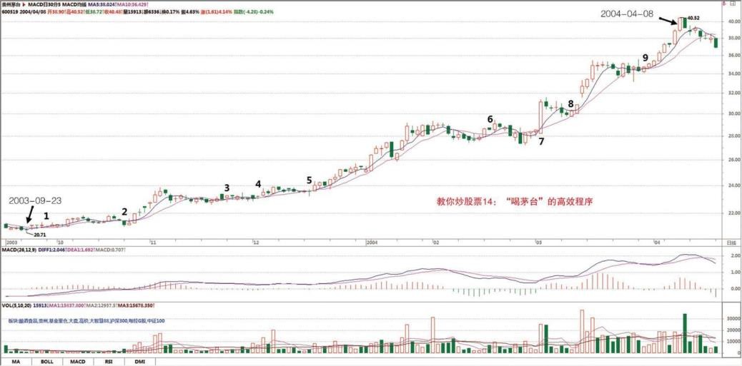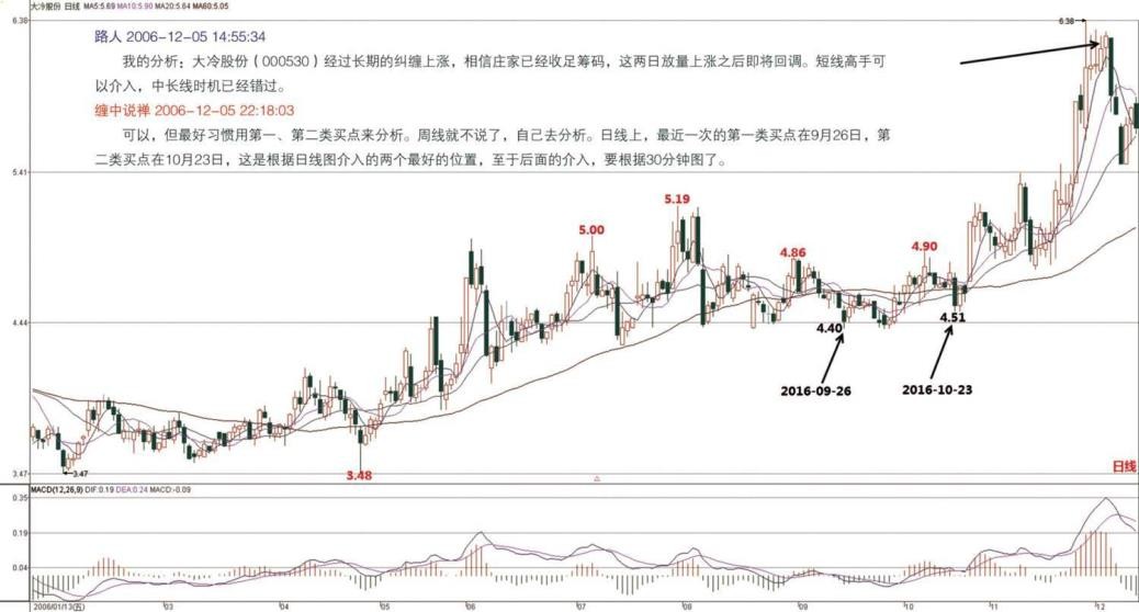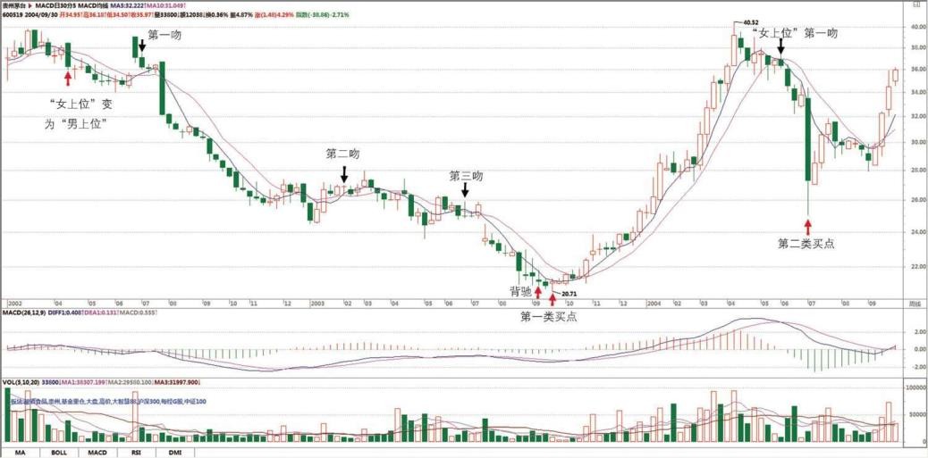 使是站在日线的角度,2005 年 12 月 13 日介入的贵州茅台,根本就没有出现卖点,唯一正确的就是坚决持有。当然,如果资金量小,不是按周线的,第一类、第二类买点都是最多按日线的,就可以相应地在 30 分钟等更小的级别内找到第一类卖点而弄出短差来,那就太细了,各位自己研究去。