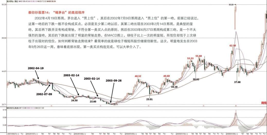 则。然后在 2003 年 6 月 27 日那周构成第三吻,是一个不太强烈的湿吻,其后的下跌就出现了明显的背驰走势,在 MACD 图上,绿柱子比上一次的明显短,而低位却低于上次绿柱子出现时的低位。如何判断背驰走势结束?最简单的就是绿柱子缩短而股价继续创新低,这次,明显地发生在 2003 年 9 月 26 日这一周,意味着底部出现,第一类买点构造完成,可以大举介入了。