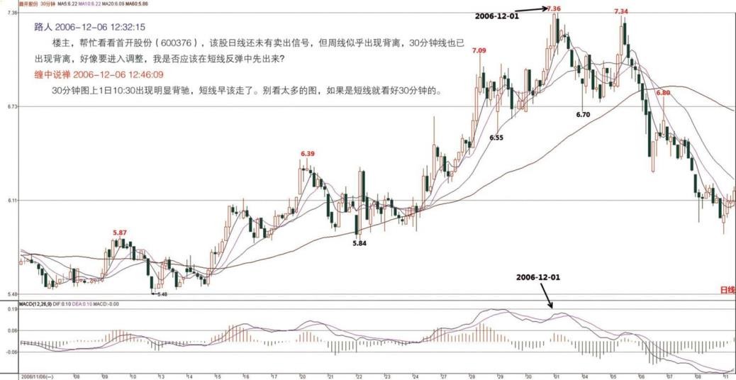 本 ID 用的 MACD 指标周期比普通的要长一倍,按普通的指标,4 月 13 日的背驰构成的是 MACD 指标双头走势,一般到零轴后都有双次拉回,这次才是构成最终的背驰。有关背驰的内容课上会详细说。(2006-12-05 22:12:54)