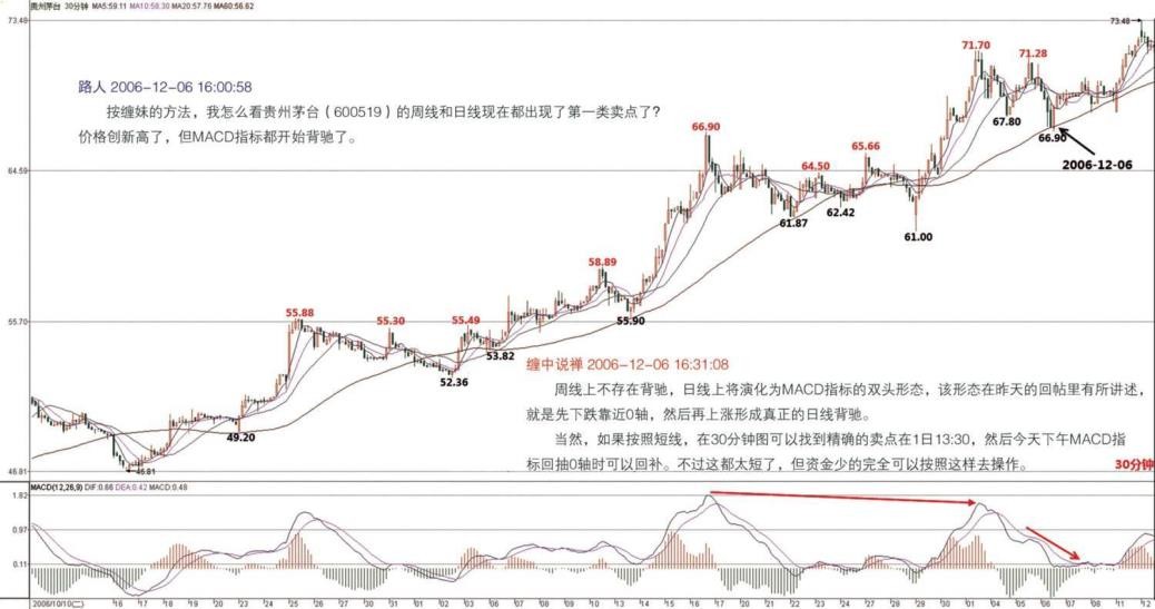 请教缠姐:关于贵州茅台 12 月 22 日买点至 2005 年 4 月 26 日的卖点,买点好理解,卖点有点儿疑问,为什么不是 4 月 13 日?那天它的 MACD 指标明显背驰了啊,我理解是其后才出现第一次湿吻(对这一次的买卖),但其后 4 月 26 日的MACD 指标又明显放大了,按当时来看应该不算背驰啊,请指教!