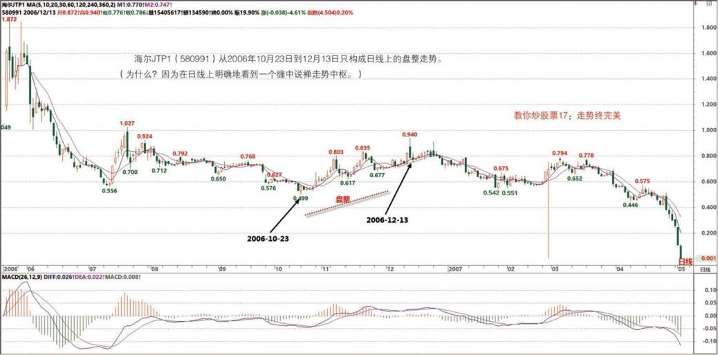 其后的上涨,驰宏锌锗(600497),2005 年 7 月 27 日到 10 月 25 日明确地出现日线上的上涨走势(为什么?因为在日线上明确地看到两个缠中说禅走势中枢),而海尔JTP1(580991)从 2006 年 10 月 23 日到 12 月 13 日只构成日线上的盘整走势(为什么?因为在日线上明确地看到一个缠中说禅走势中枢)。