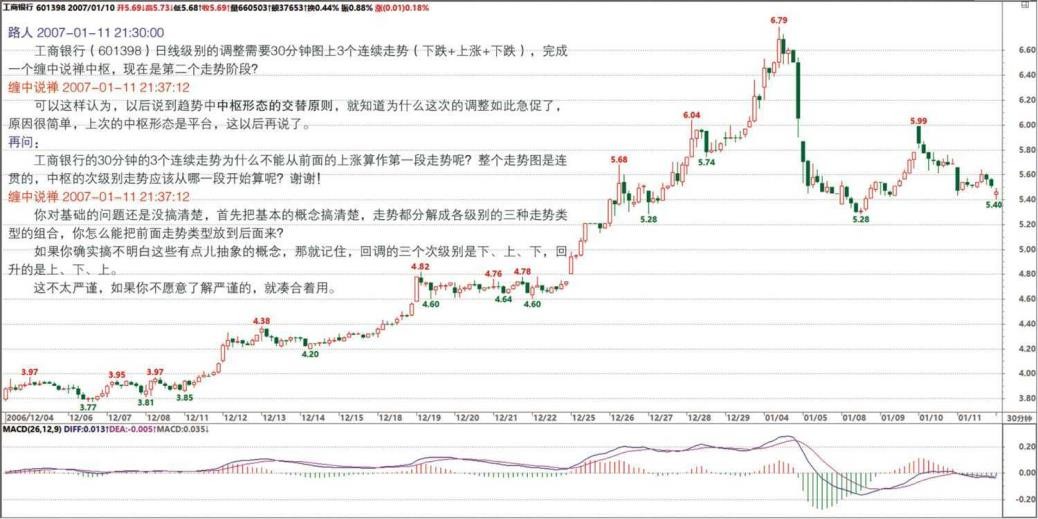 现在已经是日线的。30 分钟是后来形成的,开始的只是 5 分钟。中枢的级别是逐步加大的,这在调整中十分常见。这就是中枢扩张的意思。从一个 5 分钟的,慢慢扩张成一个日线的,甚至变成周线的。对于工商银行(601398)来说,这次下来后,必然有一个日线级别的盘整或上涨,但再上去如果不能突破该中枢,那肯定还有一波日线级别的盘整或下跌,这样就把该中枢进一步扩展成周线的了。