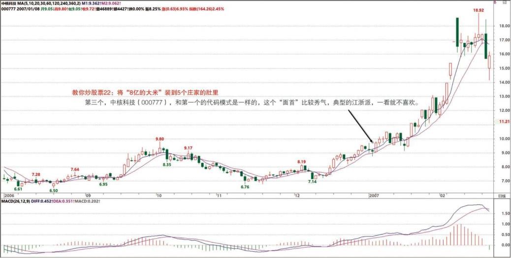 第四个,和江浙派的代码几乎一样,唯一不同就是一个在深圳、一个在上海。一个上海的山东男子是否沾染了上海女人的气味,在第一天试盘时,就不再成为本 ID 的一个疑问。对于股票,解决疑问的最好办法就是实践,真理是实践出来的。第一天的反应就不小,浮码很多,10 几个交易日前那两根大量暗示着,这男子即使不是童男,也是初涉人事没多久的。这样最好了,浮码多,水就混,藏点儿“大米”还不简单?这“大米”藏得又快又多,这种打乱仗的感觉真不错,就像一场一对多游戏,谁怕谁呀。一般来说,对于大资金来说,打乱仗是最好玩的,记得 N 年前,那次把一只股票从 7 元多一下炒了 N 倍,中