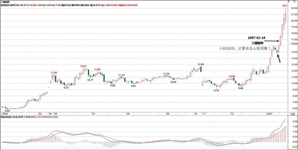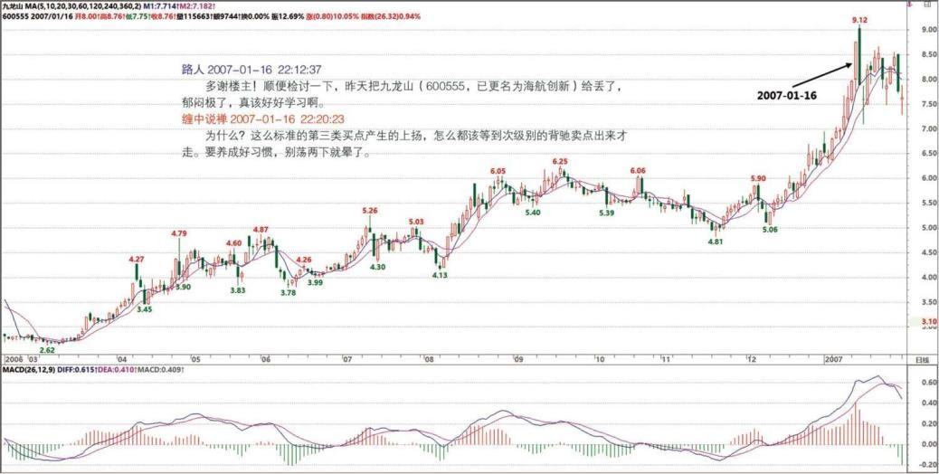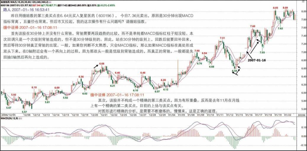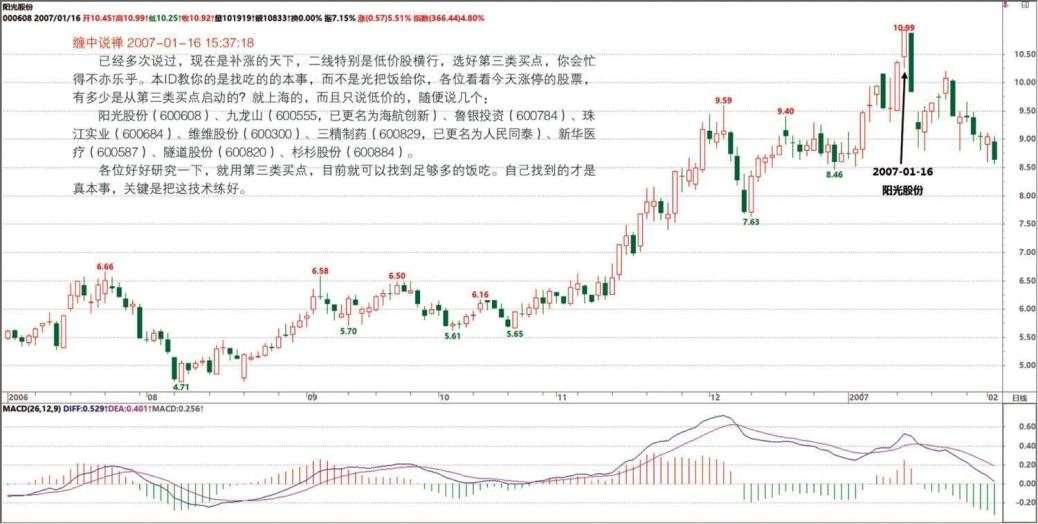起 50%,不过前面的折腾也少不了。各位最好别跟本 ID 的股票,大把股票有第三类买点的,特别是散户,一般第三类买点突破,都有至少 20%以上的涨幅,各位等 30 分钟背驰就出来,换别的有第三类买点的,这样来回几次,资金利用率就高了,没必要跟着本 ID 打仗。当然,本 ID 打仗,各位可以看现场直播。如果是药,你低位就拿着的,那就继续拿着,否则在目前的位置就算了。本 ID 又不是庄家,更不需要别人抬轿子,各自觅食去,把第三类买点的操作用熟,终身受益。( 2007-01-16 16:04:49)