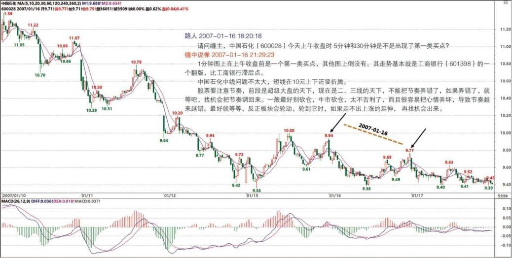 问题 3:今天的股票不少已经收复周五的失地,但从 30 分钟图上看,很多是空头排列后第一次缠绕,那么接下来要做短差的卖点是否就要盯紧 5 分钟图是否出现背驰?还是要结合什么图的均线去看?
