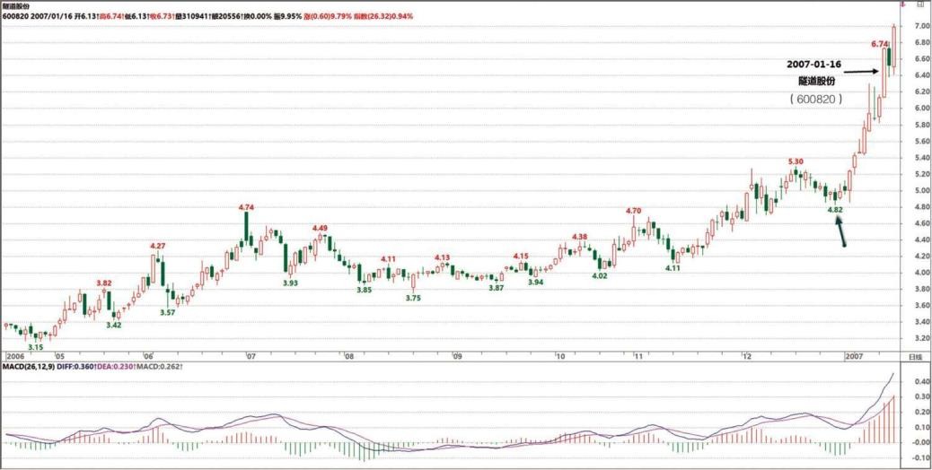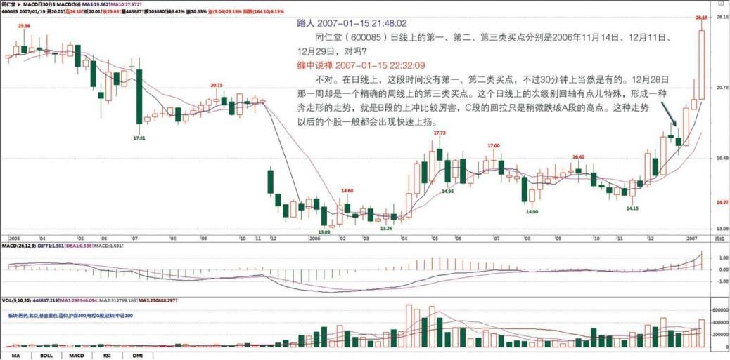 请问缠姐,你这里所说的 A、B、C 分别是哪三段?本来以为 A 段是 2006 年 12 月 11 日—20 日,B 段是 12 月 21 日—28 日,C 段是 2006 年 12 月 29 日—2007 年 1 月 5 日,可是好像跟你说的不太一样,我说的 B 段明显不是上冲。请缠姐告知分别指的是哪三段,理解了这个,那建投能源(000600)后来的急拉应该跟这是一样的道理。