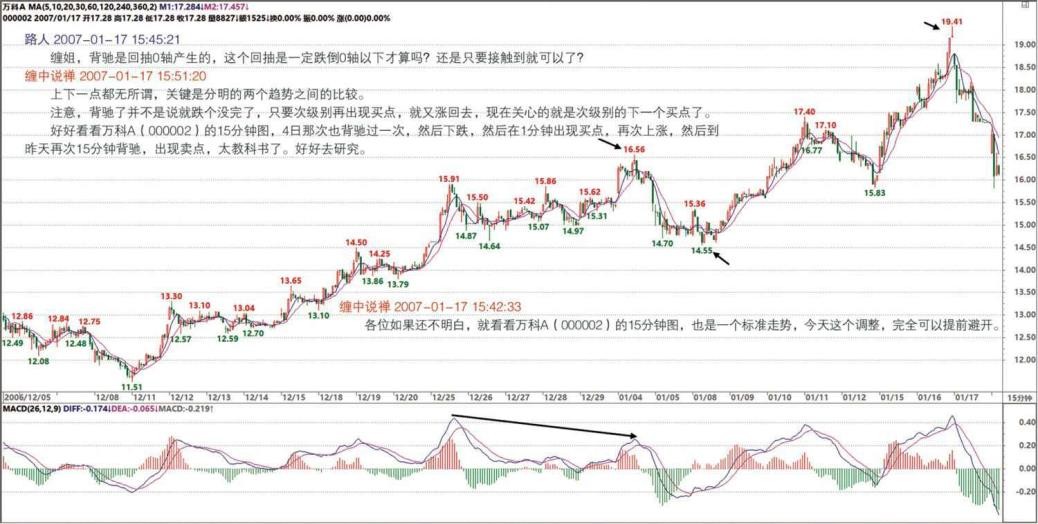 中间的 MACD 指标回抽 0 轴后背驰,自己去看看,是不是教科书一样精确?(2007- 01-17 15:25:18)