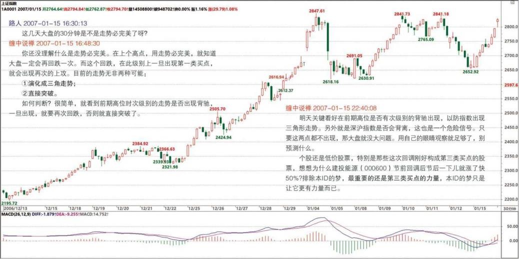 以日线的第三类买点为例,要找这个买点,就看一个 30 分钟的回抽,而该回抽低点,就看 5 分钟的背驰。必须三个级别共同来看。(2007-01-16 16:44:56)