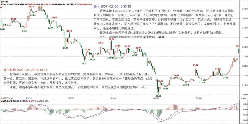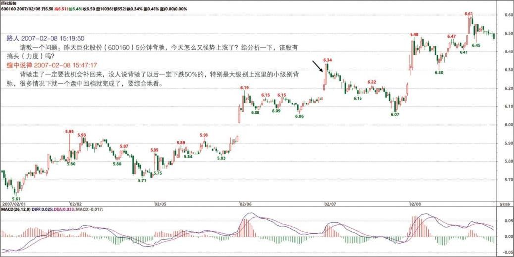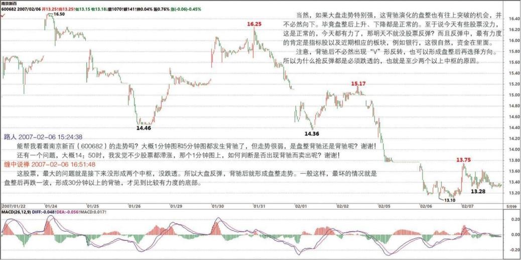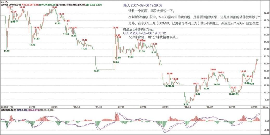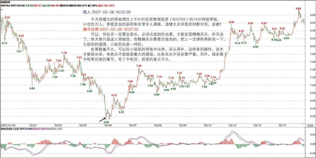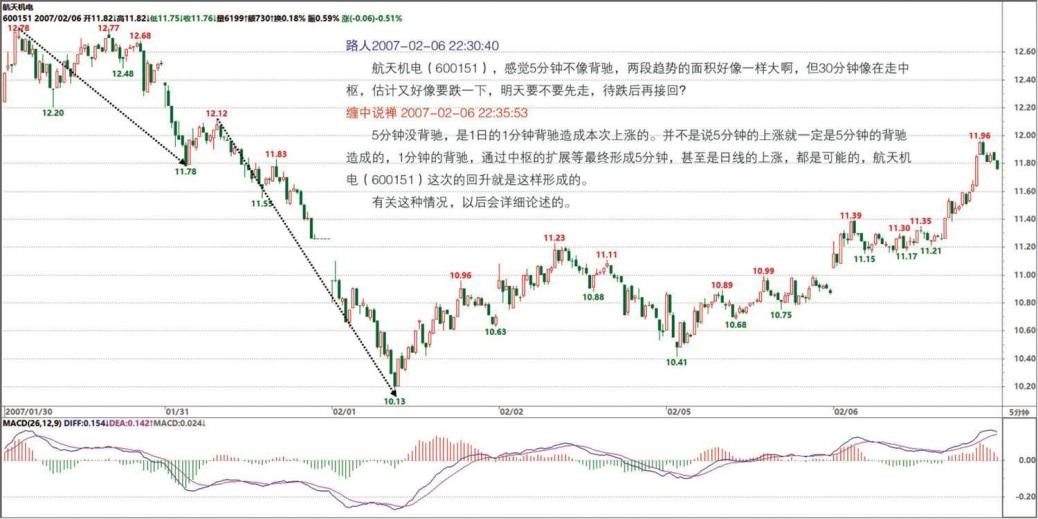其实问的主要原因是怎样在小级别做短差。因为调整幅度如果不大,又是快速拉升,往往会错过买入机会,或出现帮证券公司打工的结果。所以想搞清楚小级别如何判断背驰,即使在 0 轴回抽后,出现了新高,但 MACD 指标面积却比之前减少,这种情况下,如何判别是否在下探后再次拉升,而使后面的面积增大且大于前面(0 轴回抽前的面积)。谢谢,希望解疑!