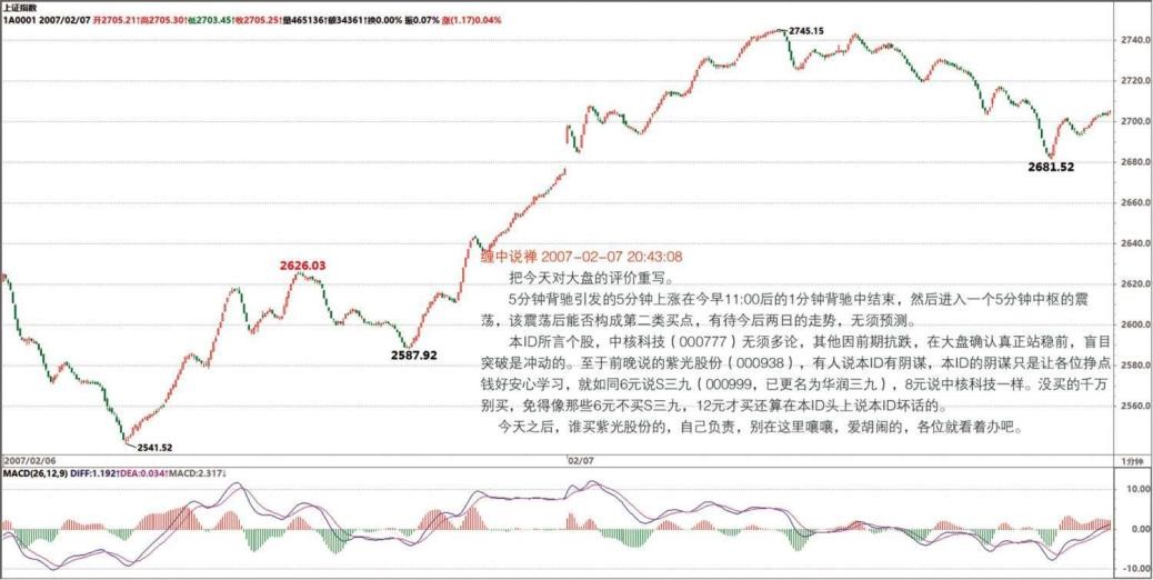 其实这个问题已经说过,想想工行、北辰的例子,都是 1 分钟顶背驰造成大顶的绝好例子。为什么?就是后面发生了中枢的逐步扩展。(2007-02-06 22:38:54)