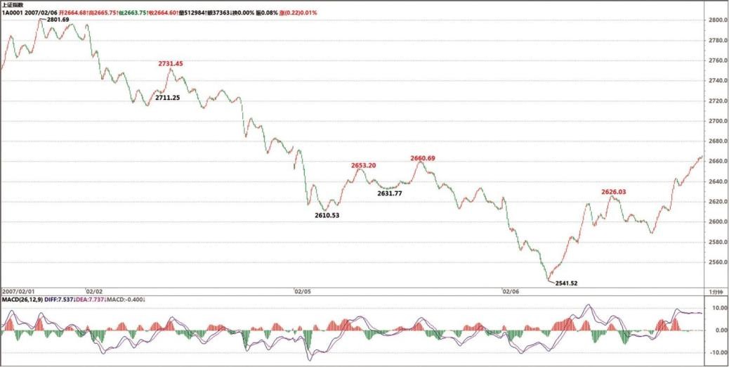 这时候就要看相应的从 2 月 5 日 13:30 开始的 1 分钟图。整个下跌必须有两个
