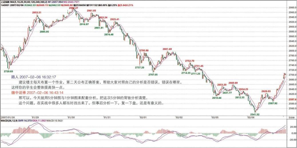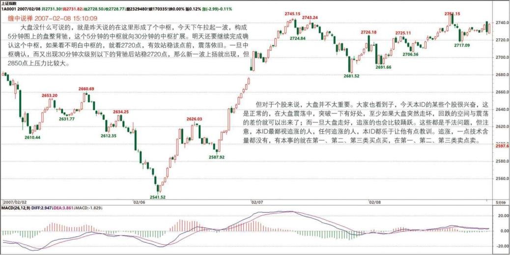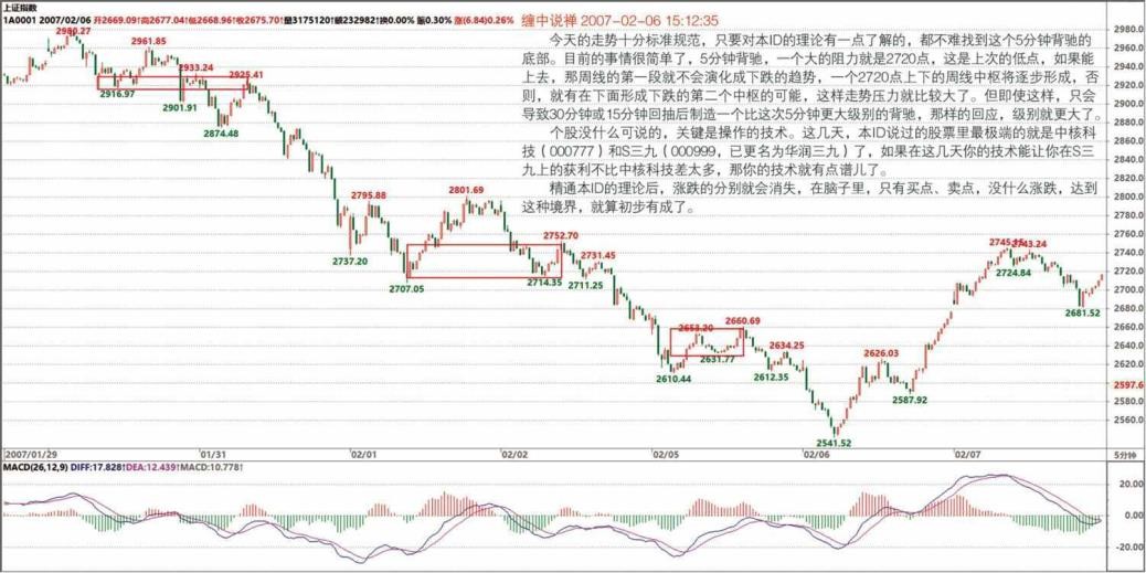 不对,MACD 指标就可以了,一般人没必要用本 ID 那个指标,那东西是精确, 但用起来很麻烦,还要自己编指标,一般人根本弄不来,还不如直接用 MACD 指标,准确率差点,但只要结合好中枢、背驰,95%以上是一点问题没有的。这就足够了。(2007-02-06 15:55:08)