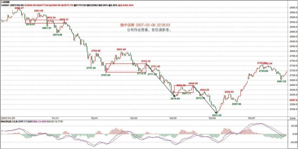 好的,但这次的功课今天不能公布答案,因为明天要说这个问题。大家注意了, 今天的功课来了。一个 5 分钟的下跌背驰后,其后的回升至少能到什么位置?把相应的回升位置做一个分类,以便确定回升的力度。(2007-02-08 16:36:39)