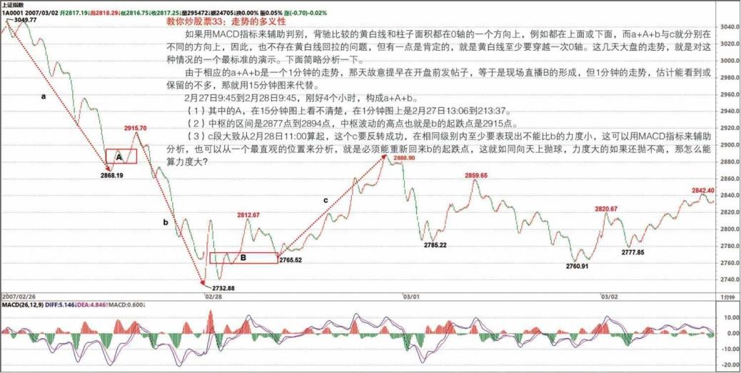a+A+b+B 是向下的,而 a+A+b 其实可以被看成是对 B 一个向上离开的回拉,而对中枢来说,并没要求所有的离开都必须按照上、下、上、下的次序,一次向上的离开后再一次向上的离开,完全是被允许的,那站在这个角度,从 B 直接反转向上,就是很自然的。那么,这个反转是否成功?不妨把这个后续的反转写成 c,那么也只要比较一下 a+A+b 与 c 这两段的力度就可以,因为中枢 B 对这两段的回拉力度是一样的,如果 c 比 a+A+b 弱, 那当然反转不成功,也就意味着一定要重新回到中枢里,在最强的情况下也至少有一次回拉去确认能否构成一个第三类买点。而 a+A+b 与 c 的力度比较,与背驰的情况没什么分别,只是两者的方向不同而已。如果用 MACD 指标来辅助判别,背驰比较的黄白线和柱子面积都在 0 轴的一个方向上,例如都在上面或下面,而 a+A+b 与 c 就分别在不同的方向上,因此,也不存在黄白线回拉的问题,但有一点是肯定的,就是黄白线至少要穿越一次 0 轴。这几天大盘的走势,就是对这种情况的一个最标准的演示。下面简略分析一下。