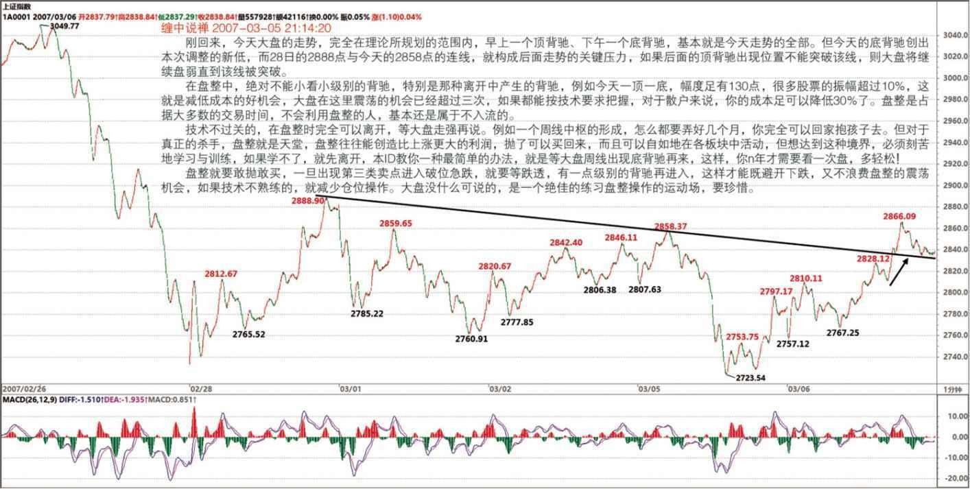 虽然没有必要精确地从最低级别的图表逐步分析,但如果你看的图表的缩放功能比较好,当你把分笔图或 1 分钟图不断缩小,这样,看到的走势越来越多,而这种从细部到全体的逐步呈现,会对走势级别的不断扩张有一个很直观的感觉,这种感觉,对你以后形成一种市场感觉是有点帮助的。在某个阶段,你可能会形成这样一种感觉,你如同站在重重叠叠的走势连绵中,而当下的趋向,仿佛照亮层层叠叠的走势,那时候,你往往可以忘记中枢之类的概念,所有的中枢,按照各自的级别,仿佛都变成大小不同的迷宫关口,而真正的路只有一条,你的心正直观地感应着。说实话,当你有了这种对市场清晰的直觉,