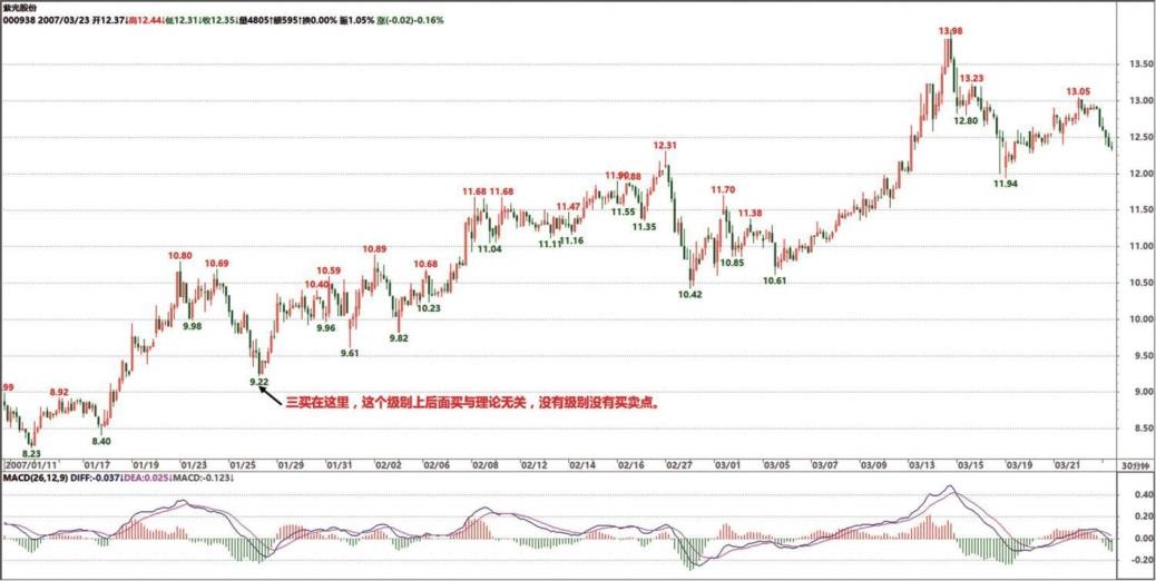 把 a 定义为 A0 ,则 Ai 与 Ai+2 之间就可以不断地比较力度,用盘整背驰的方法决定买卖点。这和前面说的围绕中枢震荡的处理方法类似,但那不是站在同级别分解的基础上的。注意,在实际操作中下一个 Ai+2 是当下产生的,但这不会影响所有前面 Ai +1 的同级别唯一性分解。这种机械化操作,可以一直延续,该中枢可以从 30 分钟一直扩展到日线、周线甚至年线,但只需理会一点,就是 Ai 与 Ai+2 之间是否盘整背驰,只要盘整背驰,就在 i+2 为偶数时卖出,为奇数时买入。如果没有,当 i 为偶数,若 Ai+3 不跌破 Ai 高点,则继续持有到 Ai+k+3 跌破 Ai+k 高点后在不创新高或盘整顶背驰的 Ai+k+4 卖出,其中 k 为偶数;当 i 为奇数,若 Ai+3 不升破 Ai 低点,则继续保持不回补直到 Ai+k+3 升破 Ai+k 低点后在不创新低或盘整底背驰的 Ai+k+4 回补。