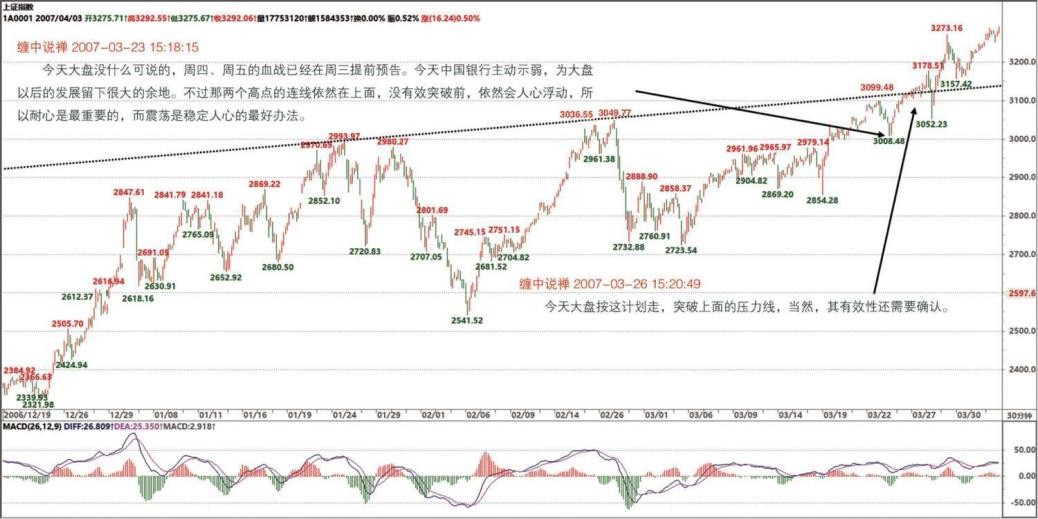 今天大盘没什么可说的,周四、周五的血战已经在周三提前预告。今天中国银行主动示弱,为大盘以后的发展留下很大的余地。不过那两个高点的连线依然在上面,没有效突破前,依然会人心浮动,所以耐心是最重要的,而震荡是稳定人心的最好办法。