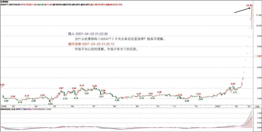 现在的走势肯定是进二退一甚至是进三退二,快速拉升只可能对“汉奸”有利,把握节奏就很重要了。真看不明白的,就看 5 日线,你看这段时间这么折腾,其实都没破过 5 日线,看着不用闹心。(2007-04-02 15:14:44)